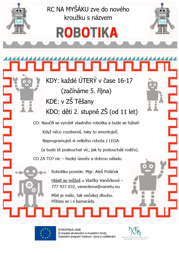 Tak jsme tu ze zbrusu novým kroužkem ROBOTIKY! děti dostanou ještě ve škole letáčky, ale pro Vás k nalédnutí už teď…zase jednou je to zaměřeno pro starší děti, tak věříme, že nebudou sedět doma u počítačů a naláká je toto: bude to super! hlaste se prosím co nejdříve!